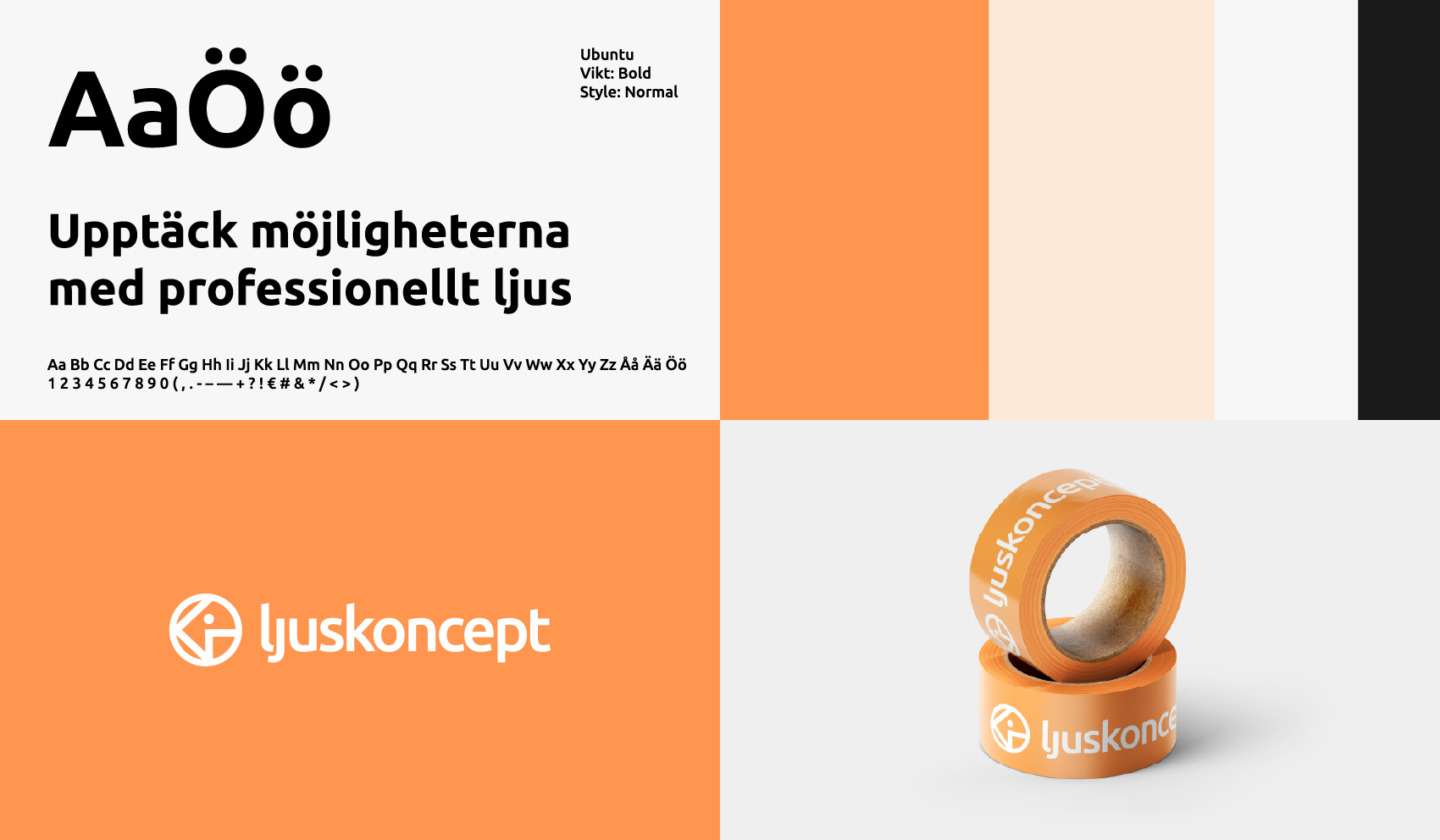 Eftersom Ljuskoncept primärt rör sig i digitala medium och utgår från ehandeln passade en horisontell logotyp bäst för ändamålet. Den orange färgen valdes för att skapa en inbjudande känsla, samma känsla som man försöker skapa med hjälp av ljus och framförallt dekorationsljus av LED-strips. Genom att också vara en mättad orange färg ville vi sticka ut från mängden online och synas tydligt.